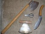 George Sears, aka "Nessmuk", was a minimalist when it came to camping and canoeing. What he called his Trinity of tools was a good folder, a small axe and a stout hunting knife. The hunting knife is a pretty close copy to his from all I could gather from his writings and drawings. I made it from a saw blade that Catfishon gave me. The axe head I bought at the CLA show this past Summer and went from there. The folder is my old Schrade. I think George would approve.